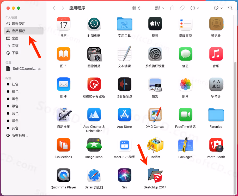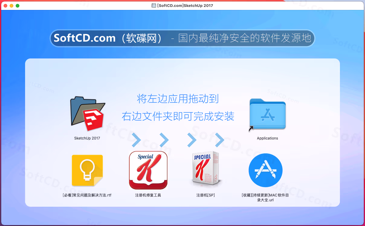 2、打开安装包,拖动整个【SketchUp 2017】文件夹到【应用程序】进行安装: